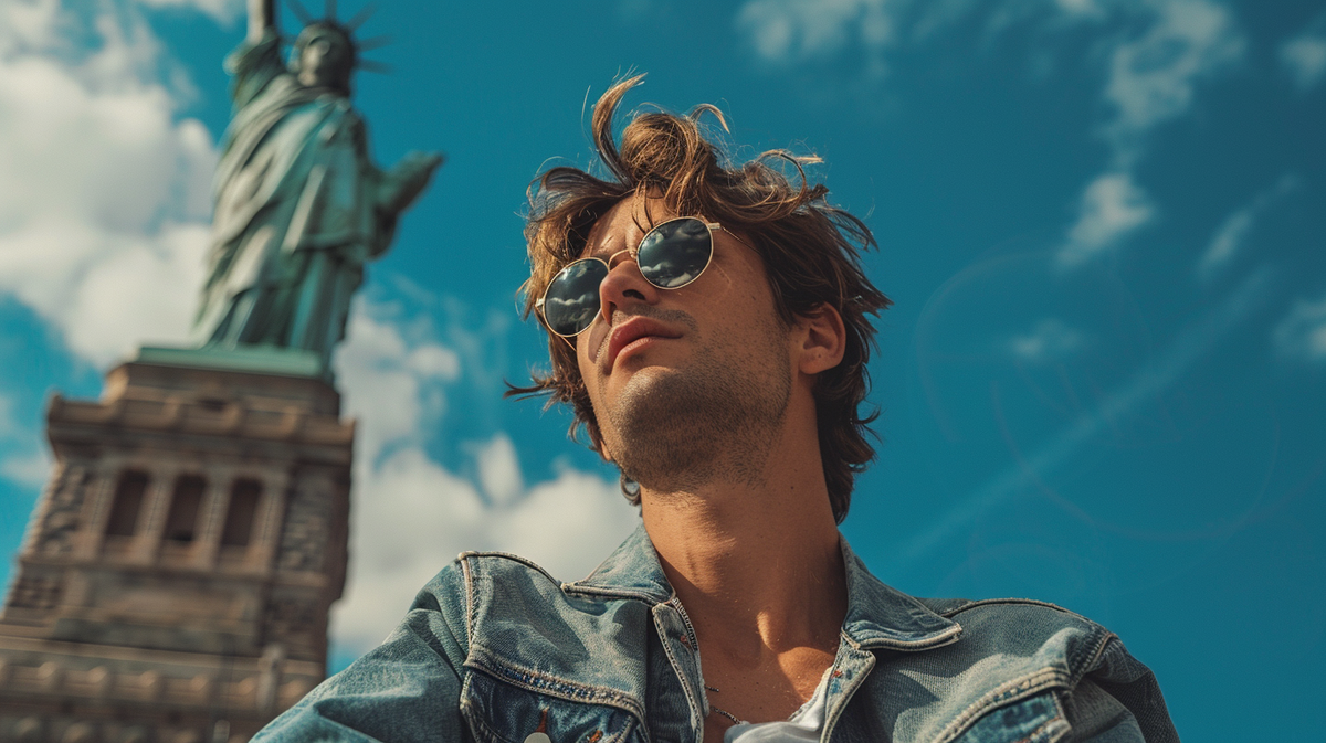 Men's ripped jean jacket styled for versatility in a dynamic, detailed photo. Spring season. European male. Oklahoma City National Memorial & Museum, Oklahoma City, OK city background.